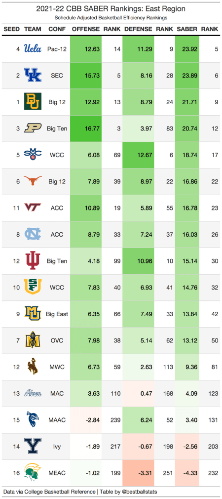 1 seeded Baylor is surprisingly not expected to win the South region. 4 seed UCLA and 2 seed Kentucky both rank higher than Baylor, and they should play each other in the Elite 8 if everything plays out as expected. Additionally, 11 seed Virginia Tech is a team to watch as they just won the ACC tournament and possess a top 20 offense.