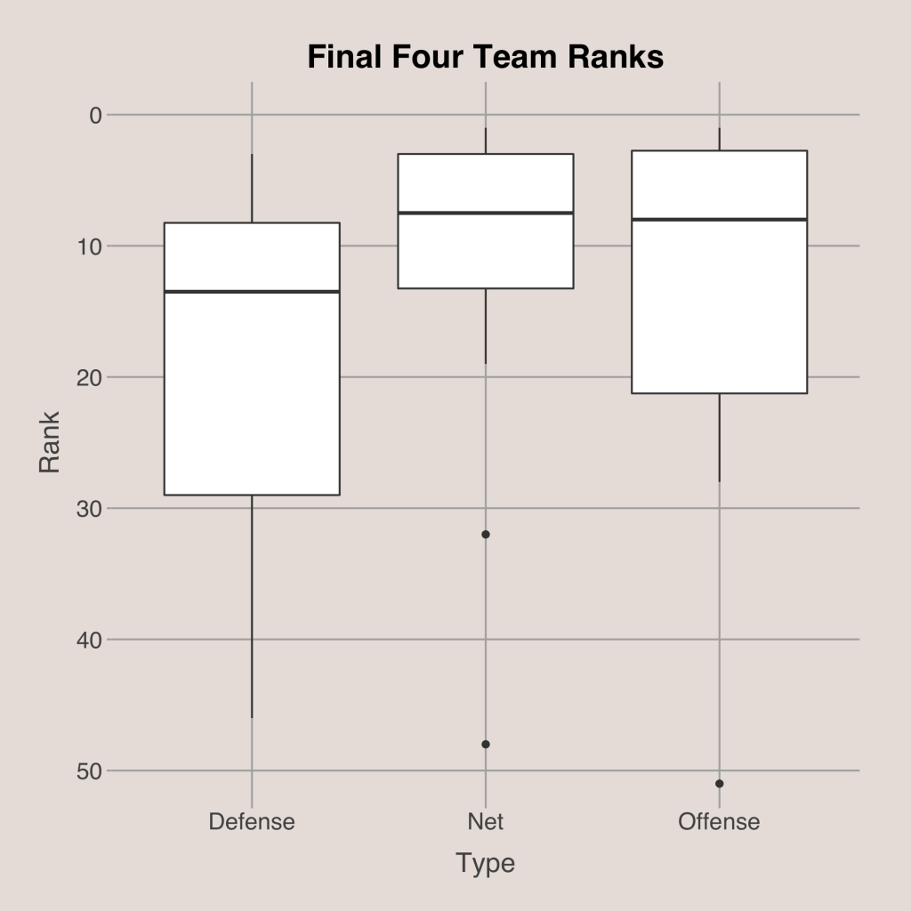 Using the characteristic of past final four teams, we can create a small groups of final four candidates for this year’s tournament. Since 2015, teams in the final four tend to have an offense ranked in the top 30, a defense in the top 50, and an overall rank in the top 20. This excludes outliers like South Carolina in 2017, Syracuse in 2016, and Loyola Chicago in 2018 since these runs are unlikely and nearby impossible to predict.