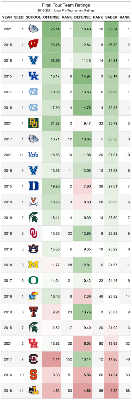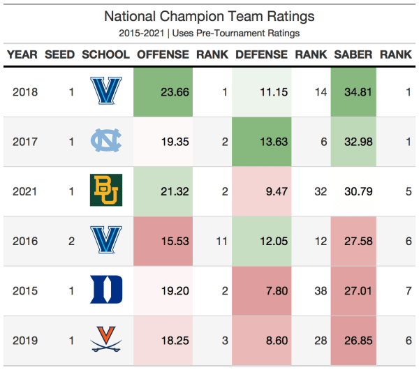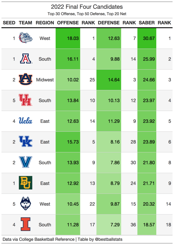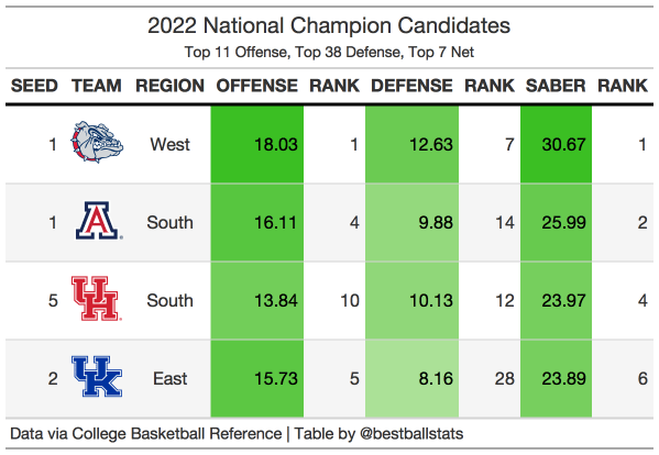 While watching all the tournament games are fun and create lots of upsets, the eventual champion is almost always a team that was expected to win. A 1 or 2 seed has won each of the past 6 tournaments, and each of the last 6 national champions have ranked within the top 7 of SABER. Offense is a better indicator than defense when it comes to picking national champions, as all but 1 of the last 6 champions had a top 3 offense. However, it is still necessary to have a good defense, with all the national champions having a top 40 defense. The list of teams in 2022 that has a top 11 offense, top 38 defense, and top 7 overall team includes Gonzaga, Arizona, Houston, and Kentucky. These are the national champion contenders for this season. And because most champions have had a top 3 offense, Gonzaga becomes the most likely champion. Gonzaga is the only team with a top 3 offense, top 40 defense, and top 7 overall team, which is why they are the most likely national champion.