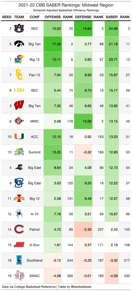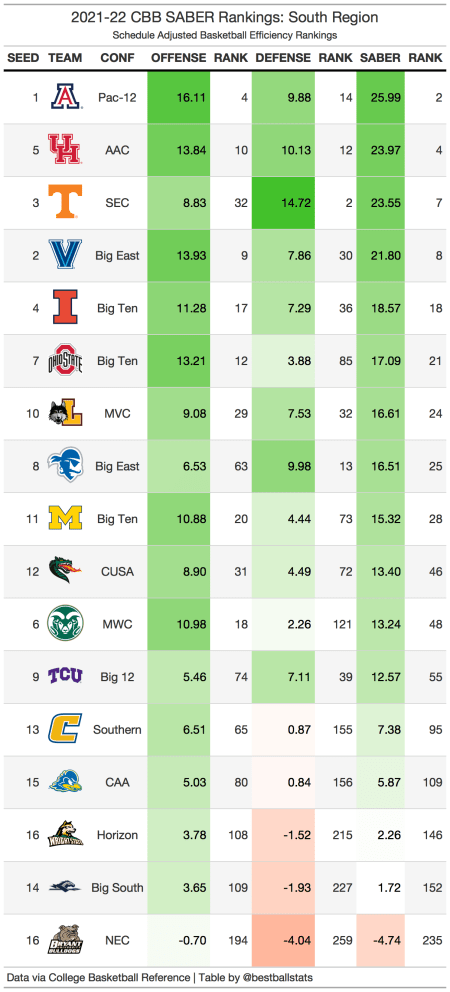 The South region is the most top heavy region this year. Arizona, Houston, Tennessee, and Villanova each rank within the top 8 of SABER. A potential Sweet 16 matchup between Arizona and Houston would be massive, pitting the top 2 teams in the region against each other before the regional final.