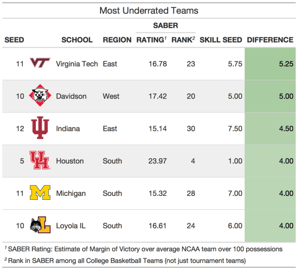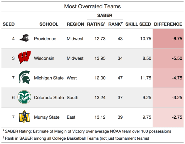 By comparing each team’s SABER ranking to their seed, we can find the most underrated and overrated teams of the tournaments. The most overrated teams include Providence, Wisconsin, Michigan State, Colorado State, and Murray State. Each of these teams are candidates to be upset in the first round since they have their skill level does not match their seed. Providence has the skill level of a 10 or 11 seed despite being a 4 seed, and Wisconsin has the skill of an 8 or 9 seed despite being a 3 seed.
