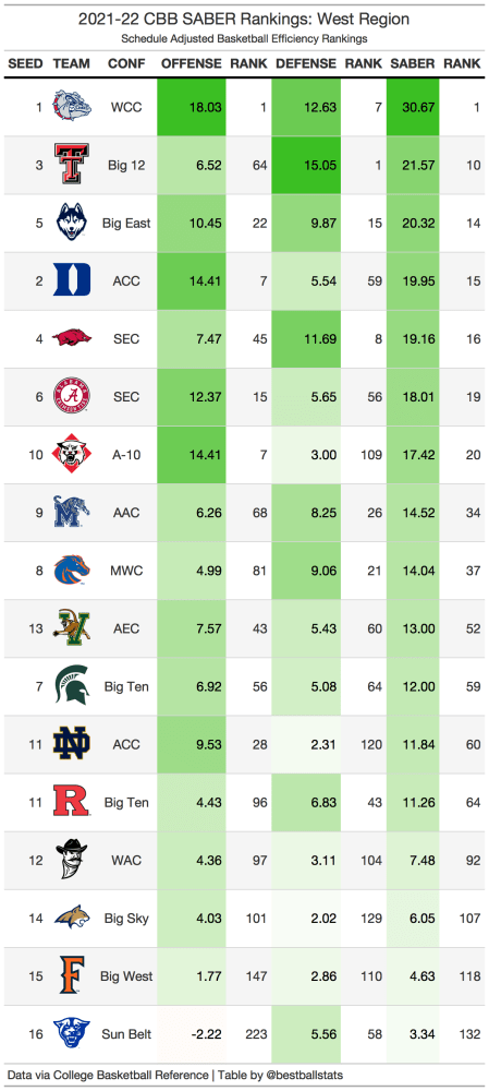 In the West region, Gonzaga and Texas Tech are the most likely final four contenders. Gonzaga, Duke, and Davidson possess the best offenses, while Texas Tech, Gonzaga, and Arkansas lead the way on the defensive side. This is a very strong region with 7 top 20 teams. A Cinderella candidate is Davidson, while it should not be surprising if Duke loses earlier than expected.