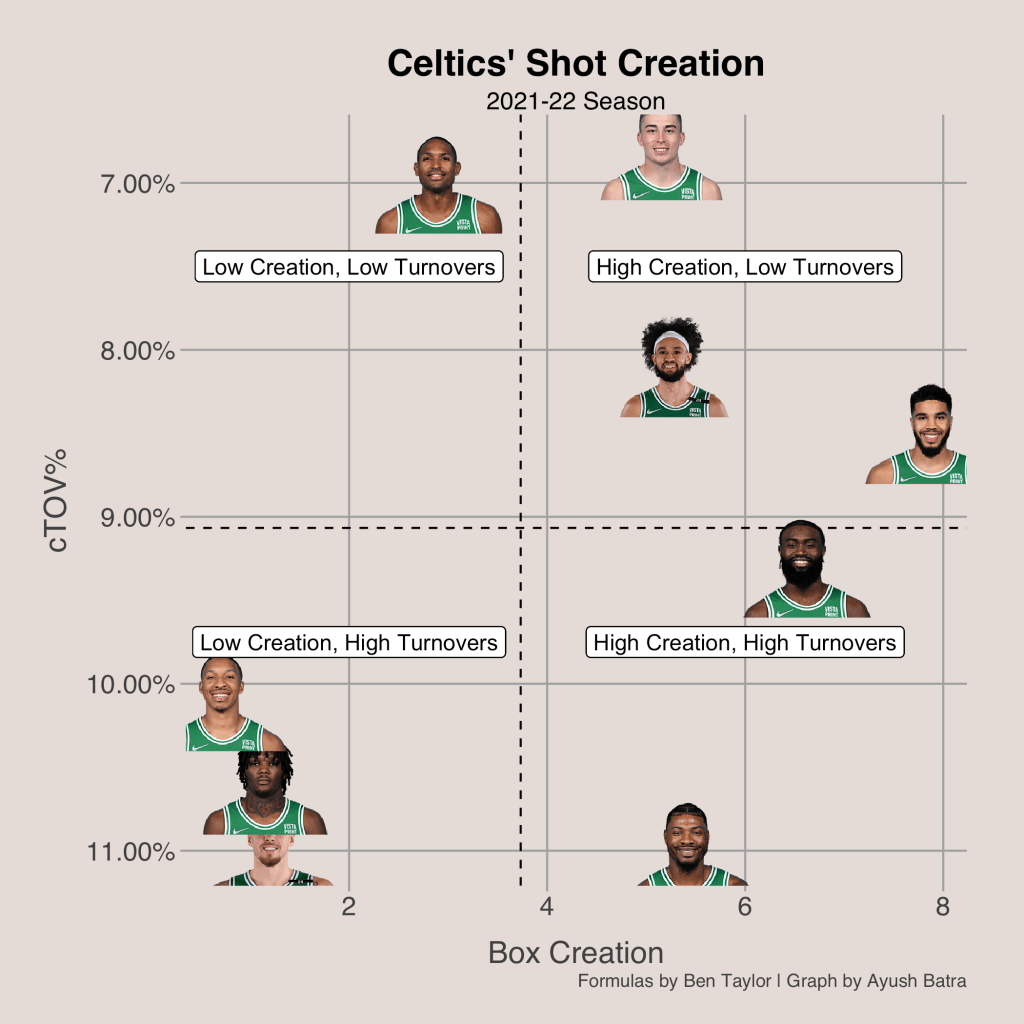 The theme with the Celtics offensively seems to be balance. The Celtics have a balanced offensive attack, a balanced mix of players that are good at the rim, and, a balanced mix of players who can create their own shot. Another element of the Celtics balance is their balance of players that can initiate the offense. Using box creation (a stat developed by Ben Taylor that estimates the number of open shots created per 100 possessions), the Celtics have 5 players who create over 5 shots per 100 possessions. These players are Tatum, Brown, Pritchard, Marcus Smart, and Derrick White. What’s even more impressive is that all of them except Smart are good at limiting turnovers. This is a strength because it decreases the variance of the Celtics offense. With multiple shot creators, it is very unlikely that all of them are playing poorly, ensuring that the Celtics offense doesn’t sputter. In contrast, the Hawks, Mavericks, and Nuggets are more heliocentric, meaning the offense flows primarily through one player. A result of this is that these teams struggle more in the playoffs because defenses have an easier time game-planning to stop just one player as opposed to five. Having just one high usage shot creator also makes a team’s offense less consistent because if the main creator is having a bad game, the offense cannot operate.