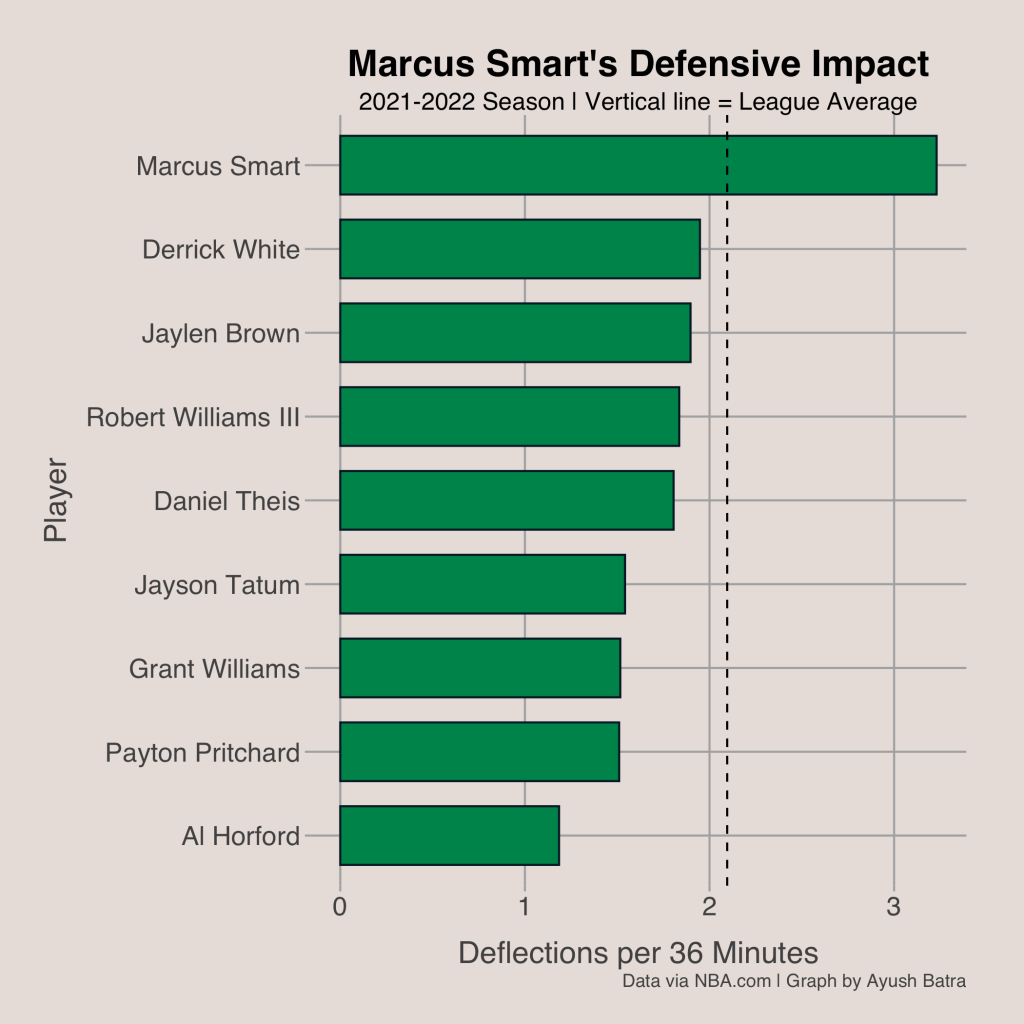 You may be wondering where Marcus Smart factors into the Celtics’ defense. The Defensive Player of the Year winner must factor into the Celtics’ astounding defense somehow, right? Well, the answer is yes. But his major effect on the game doesn’t come from his ability in contesting shots (although he is still very good at this). Instead, his impact in limiting offenses stems from his ability to be a pest and force lots of turnovers and low quality possessions by deflecting the ball. Marcus Smart records 3.2 deflections per 36 minutes, ranking in the 90th percentile of the NBA. This is huge for a Celtics team that gets the 4th fewest deflections in the NBA, their one defensive weakness. By deflecting the ball, Marcus Smart is able to either take a possession away from the offense or put the offense in a scramble mode where they have to recover with fewer time on the shot clock, leading to worse quality shots. This trait will be important for the Celtics moving forward, especially as they face offenses that tend to turn the ball over rarely, like the Suns, 76ers, and Bucks.