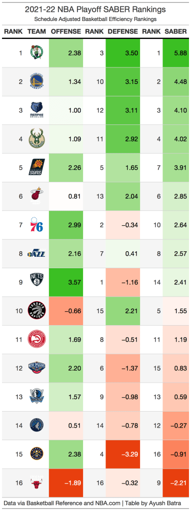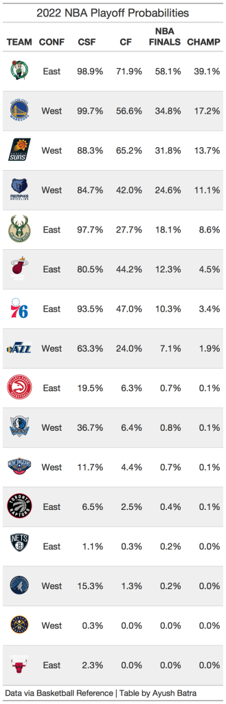 There are two other reasons why I believe the Celtics are the title favorites, but they don’t necessarily fit into the category of offense or defense. The first is playoff experience. The Celtics’ two leading players may be on the younger side, but that doesn’t mean they don’t have playoff experience. The Celtics’ core of Jaylen Brown, Jayson Tatum, and Marcus Smart has played in the Playoffs every year since 2018 (advancing as far as the Conference Finals in 2018 and 2020), making this year their 5th playoff run together. In addition, Al Horford has played in the Playoffs 13 different seasons. As a result, the Celtics have 4 rotational players with at least 1700 playoff minutes, which is the most of any team in this year’s Playoffs. Even when including their less experience players and taking the weighted average of career playoff minutes (where the weight is regular season minutes per game), the Celtics have the 7th most experienced playoff roster, just behind Miami and Phoenix, both of which have made the Finals in the past two years. Even though the Celtics are young, playoff experience is not an issue.