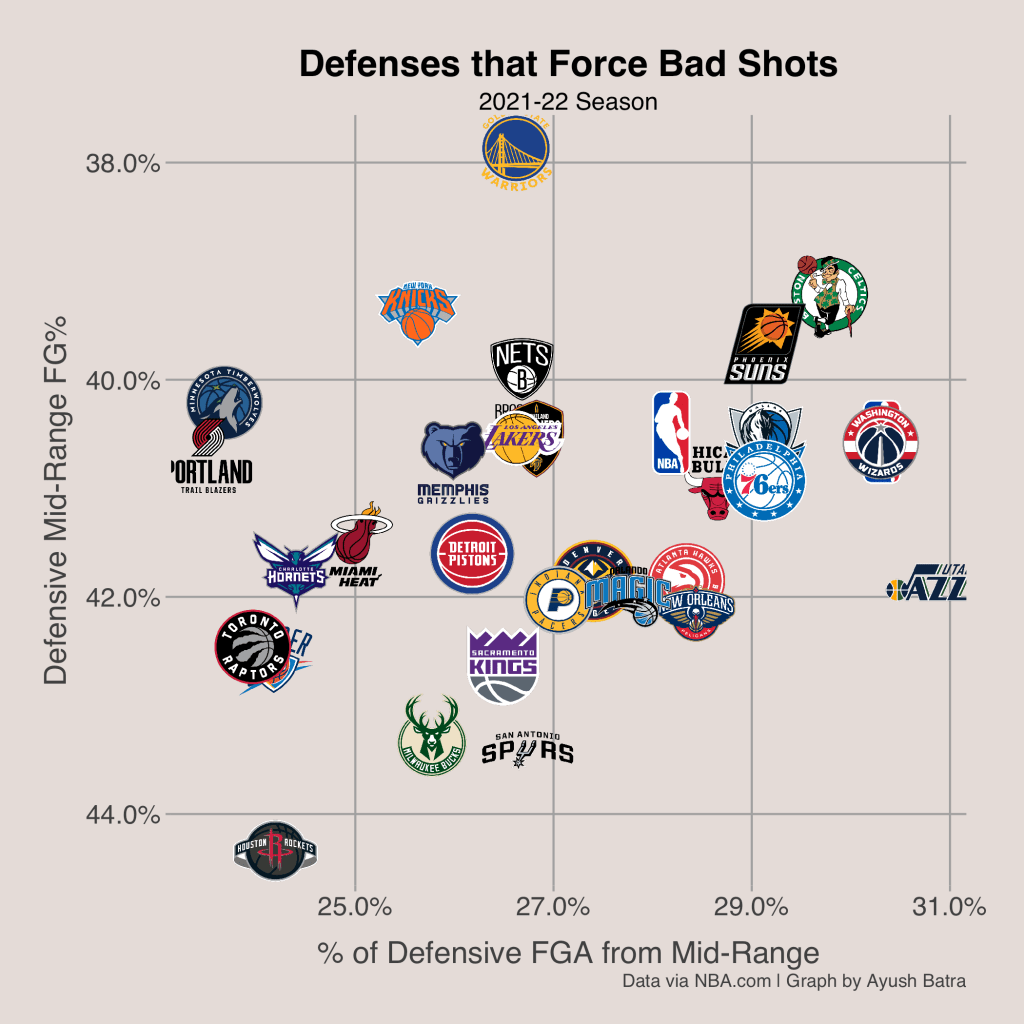The Celtics having a good rim defense is obviously helpful, but what may be even more impactful is the fact that they allow very few shots at the rim. They allow the 5th lowest frequency of shots at the rim, the 5th lowest frequency of dunks, and the 6th lowest frequency of layups. As mentioned earlier, shots at the rim have the highest expected value, so the Celtics are forcing opponents to take lower value shots, decreasing their expected output. However, the Celtics defense isn’t like the Bucks, who notoriously have allowed few shots at the rim at the expense of allowing a lot more three point attempts. Rather, the Celtics are forcing their opponents to take more mid-range shots. This makes their defense even better as mid-range shots have the lowest expected value of almost any shot.