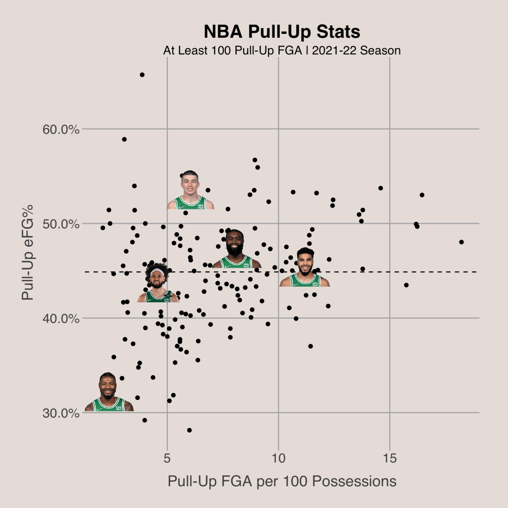 If defenses are stopping the Celtics from getting to the rim, they can operate in the mid-range to create their own shots. Jayson Tatum and Jaylen Brown specialize in creating their own shot off the dribble, with a 45.5% and 47.4% eFG% respectively on over 7.5 pull up field goals per 100 possessions each. One of the Celtics’ most under-the-radar players is Payton Pritchard. Pritchard has been a great offensive spark off the bench, showing the ability to create his own shot and serve as a good spot up shooter. Pritchard averages 1.073 points per shot on pull-up field goal attempts and 1.256 points per shot on catch and shoot attempts, ranking in the 94th and 90th percentile of the NBA, respectively. When the Celtics need a bucket in a tough situation, at least of one Tatum, Brown, and Pritchard should come through. All three of them shoot well on contested 3-point attempts, making at least 34% of these shots. While I’m talking about 3-point shooting, the Celtics offense has only one player (Robert Williams III) that won’t shoot 3’s. Among the Celtics’ other 8 playoff rotation players, 4 are very good floor spacers (Jaylen Brown, Jayson Tatum, Payton Pritchard, and Grant Williams) and 4 are willing to shoot but aren’t as efficient (Al Horford, Marcus Smart, Derrick White, and Daniel Theis).
