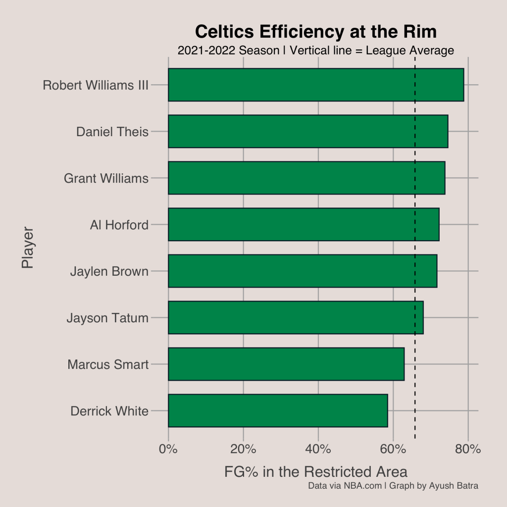 The Celtics offense is one of the most balanced in the NBA. They are efficient on shots at the rim, pull-up field goals, and contested three point attempts. The Celtics have shot 69.6% inside the restricted area this season, the 3rd best mark in the league. Their rim efficiency has been led by the efforts of cut and roll big men like Robert Williams and Daniel Theis in addition to star players Jayson Tatum and Jaylen Brown. Williams has a field goal percentage of 81.4% off cuts, making him a versatile player on offense by capitalizing when the defense pays too much attention to the ball handler. Theis has been an effective rollman on pick and rolls, having the ability to roll to the rim or pop out for a 3-point attempt while scoring 1.42 points per possessions on these plays.