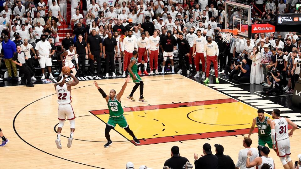 Jimmy Butler’s pull-up 3-point percentage during the 2021-22 regular season and 2022 playoffs was 25.8% as hit hit 17 of 66 shot attempts. The chance of the Celtics scoring on 1 possession can be calculated using game-level stats. The Celtics had about an estimated 98.6 possessions (85 FGA + 0.44*24 FTA + 13 TOV – 10 OREB). They scored at least 2 points on about 41.6 of these possessions (FGM + (FT%)2 * 0.44 * FTA), so they scored on about 42.2% of possessions.