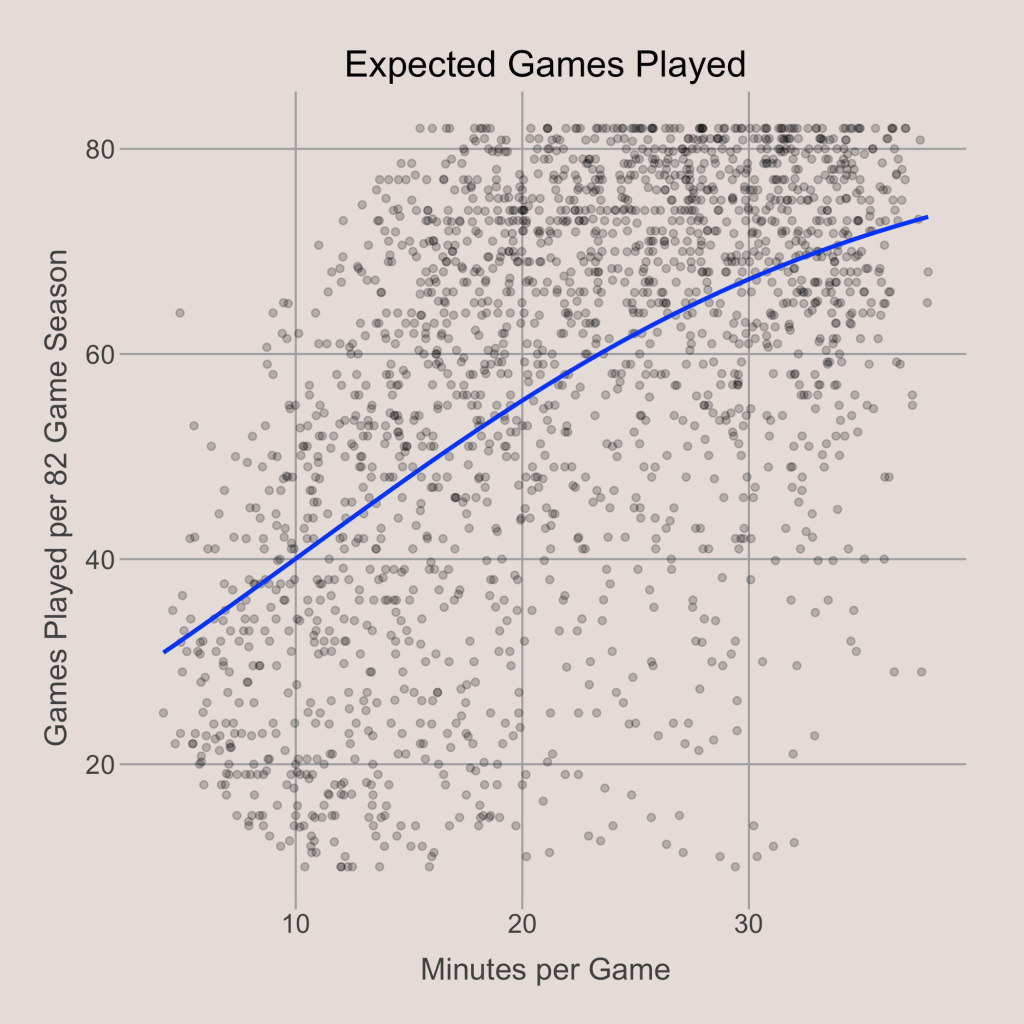 After running a regression to find the expected number of games played based on minutes per game, I adjusted this number to how many games are in a season. Because the sample includes regular season data from the 2017-18 season to the 2021-22 season, there were different numbers of total games played per team in different seasons. Because of COVID, teams in the 2019-20 season played between 64 and 75 regular season games while the 2020-21 regular season was shortened from 82 games to 72 games per team.