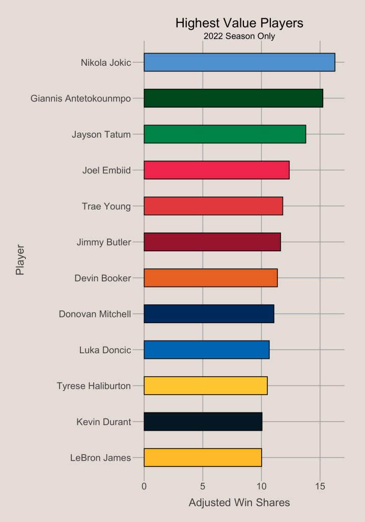 After calculating the Adjusted Win Rates of the players, simple arithmetic will lead us to how many wins each player adds to the team. If the Adjusted Win Rate is multiplied by total minutes then divided by 48, we arrive at the Adjusted Win Shares. The players with the most Adjusted Win Shares in the 2021-2022 NBA season are shown below.