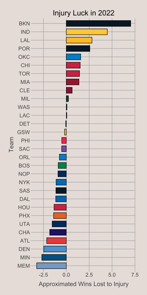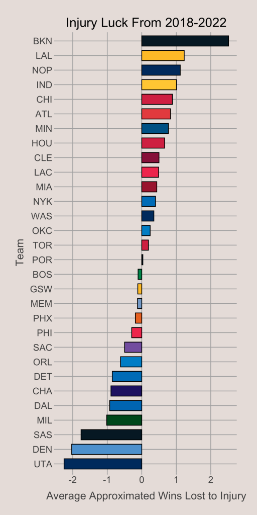 The average wins lost to injury for all 30 NBA teams during the 5 year sample is shown above. The Nets have had the least fortune with injuries, as absences from Irving and Durant in the past few seasons have limited them from reaching their true potential. The Lakers have also lost seasons due to injury as LeBron James and Anthony Davis have both had extended absences in the past few years. The Pelicans have gotten poor luck with Anthony Davis missing much of the 2019 season, Zion Williamson missing most of his rookie year (and all of the last season), and Brandon Ingram playing just 55 games (expected to play 70.7 games) in 2021-22.