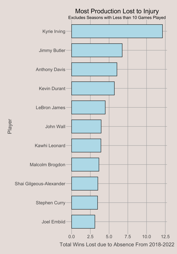 Finally, by adding up values from 2018 to 2022, I found the total cost of injuries in wins for each player. Kyrie Irving has lost his teams over 12 total wins due to absences from injuries and COVID, which is almost double the next highest player. Still, injuries to stars like Butler, Davis, Durant, and LeBron are preventing their teams from getting better seeds in the playoffs and an easier path to the finals.