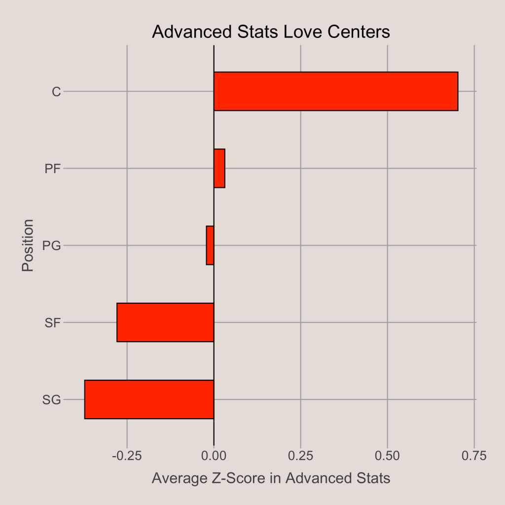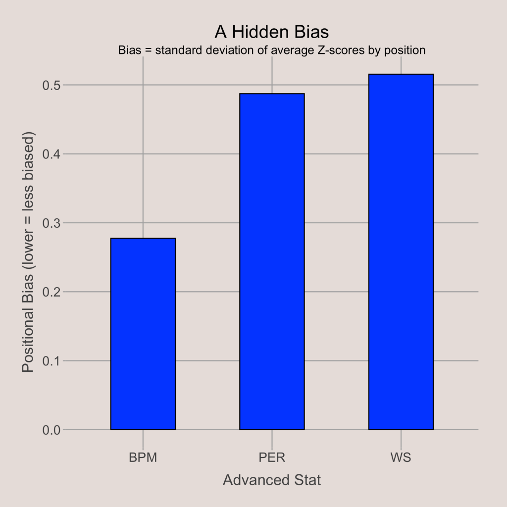 This issue is not limited to only win shares. While win shares per 48 minutes has the greatest positional bias of the 3 advanced metrics I used, PER and BPM still favor centers over other positions. In the graph below, I measured the positional bias by first putting all 3 metrics on a standardized scale, then finding the average z-score by position for each metric, and finally taking the standard deviation of the average positional z-scores.
