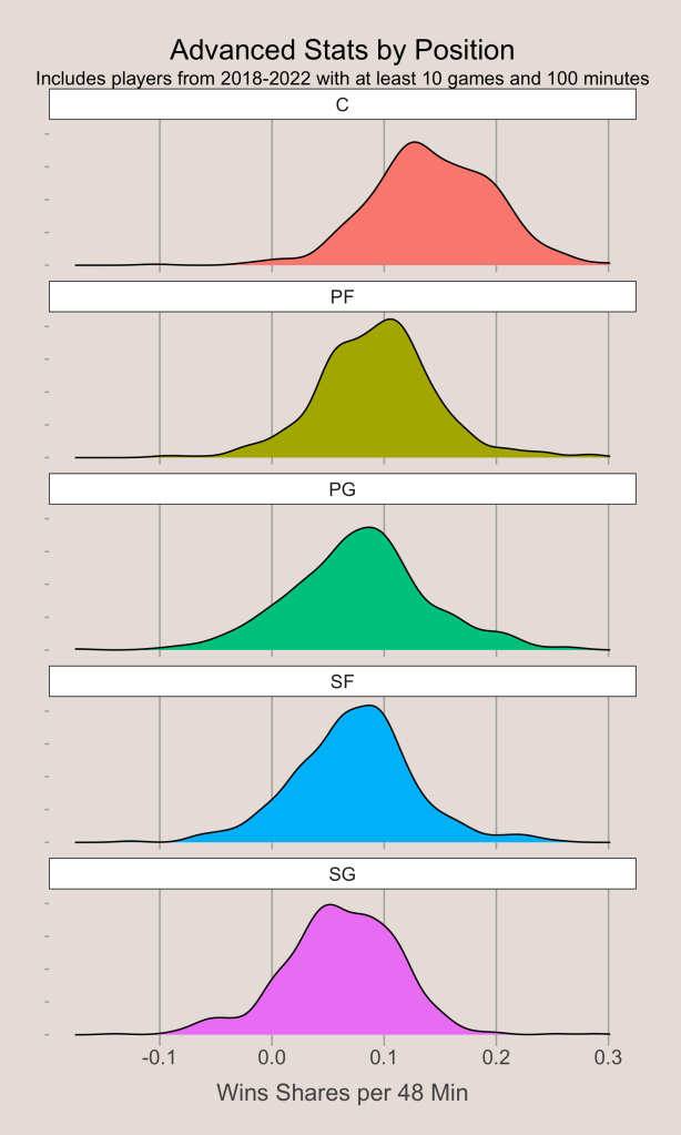 Let’s look at the first issue: positional bias. All 3 of the stats are biased towards different positions in some way. For example, win shares value centers over every other position by a significant amount, while shooting guards and small forwards tend to have lower values.