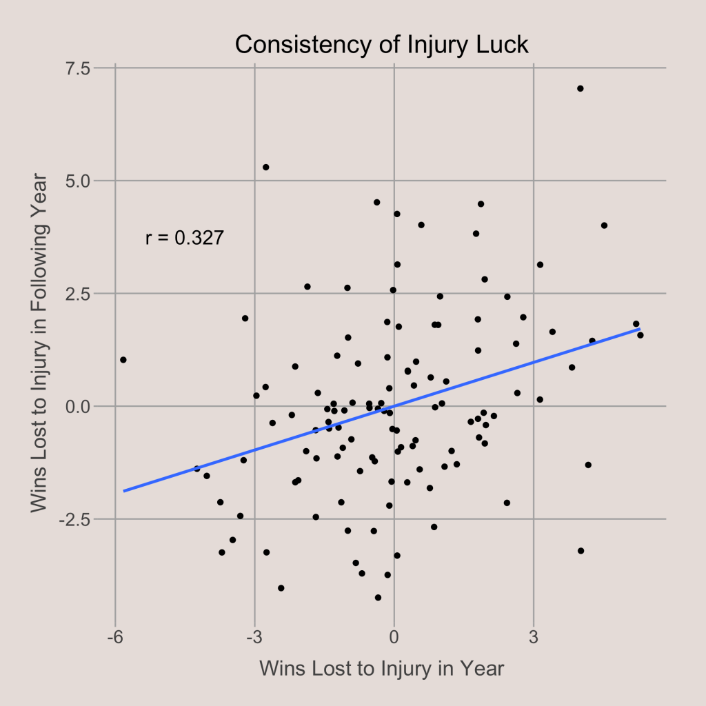 The final aspect of injuries that I wanted to explore was the consistency of injuries from year to year. Using total injury wins by team, I found the correlation of injury wins from one season to the next. The correlation comes to be 0.327, meaning there is a very moderate positive association in injury wins from one season to the next. This was surprising to me since I expected the correlation to be a lot smaller. This means that there is some degree of predictability in injuries. We can expect the Nets to have some injury problems next season (although not as much) because Kyrie Irving and Kevin Durant are still on the team (for now), and both of them have extensive history or injuries or absences.