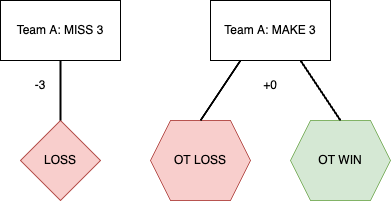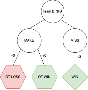 While the outcomes after a quick 2-point attempt are complicated, the possibilities after a 3-point attempt for the tie are easy. I assumed that teams choosing to go for a 3 would be taking the final shot of regulation, meaning Team A’s chance of winning is equal to the chance of making the 3-point attempt multiplied with the probability of winning in overtime.