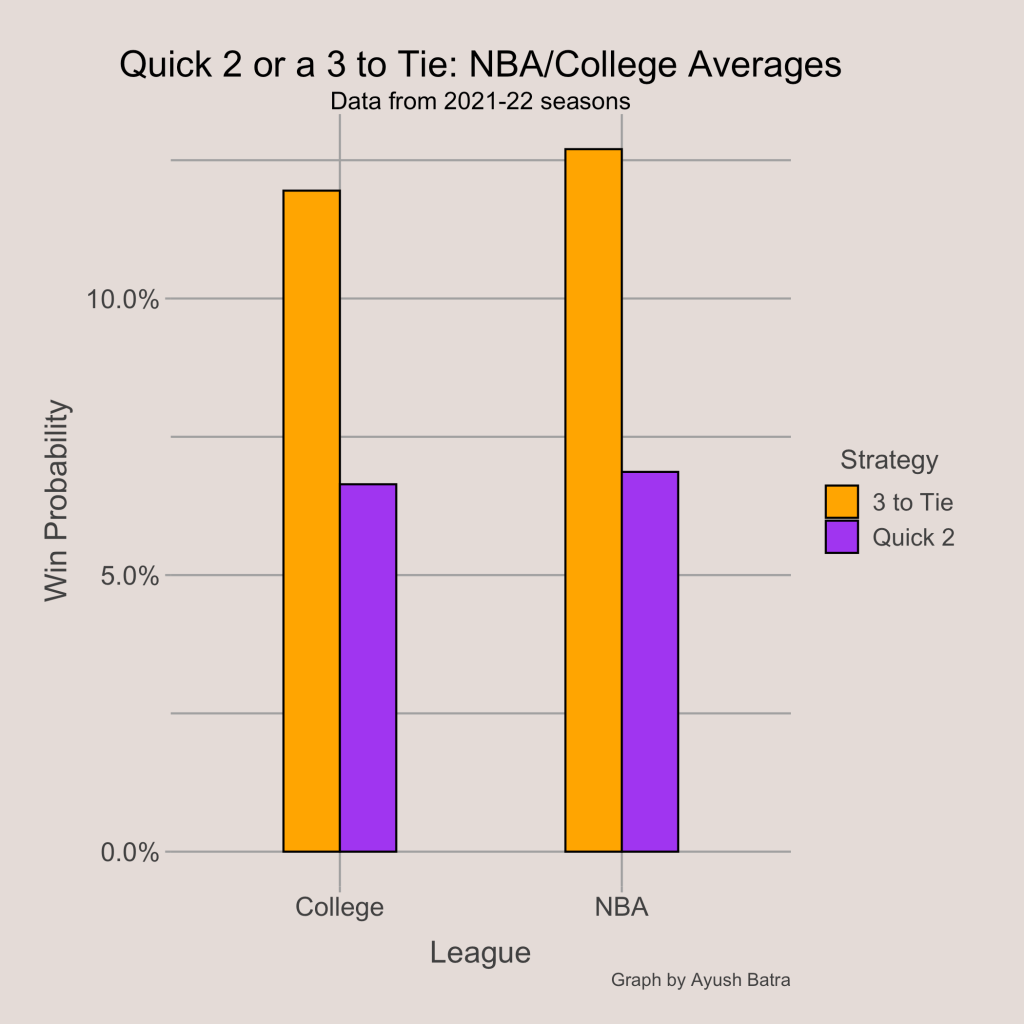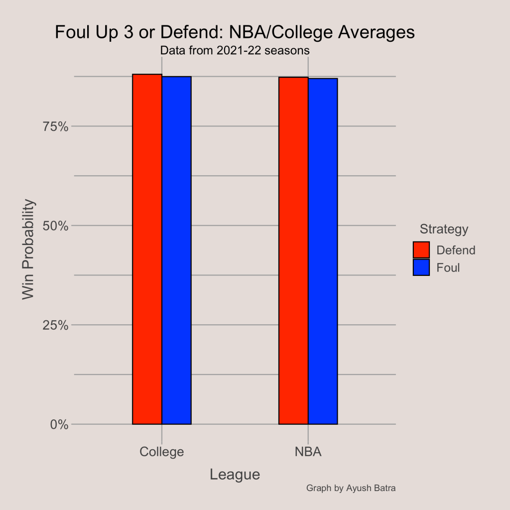 Using NBA and College Basketball averages for the statistical categories included in the probability calculations, we can determine if there is a league-wide advantage for either fouling up 3 or defending. The NBA average free throw percentage was 77.5% in 2021-22, and the chance of winning in overtime was set to 50%. The NBA average 2-point percentage during shots that were taken with under 1 minute left in the game when leading or trailing by 5 points was about 43%, and the average 3-point percentage was about 25%. Lastly, I decided to set the Shot Clock Effect to -5%, meaning that a 2-point shot under greater time constraints would have a probability of 38% of being made.