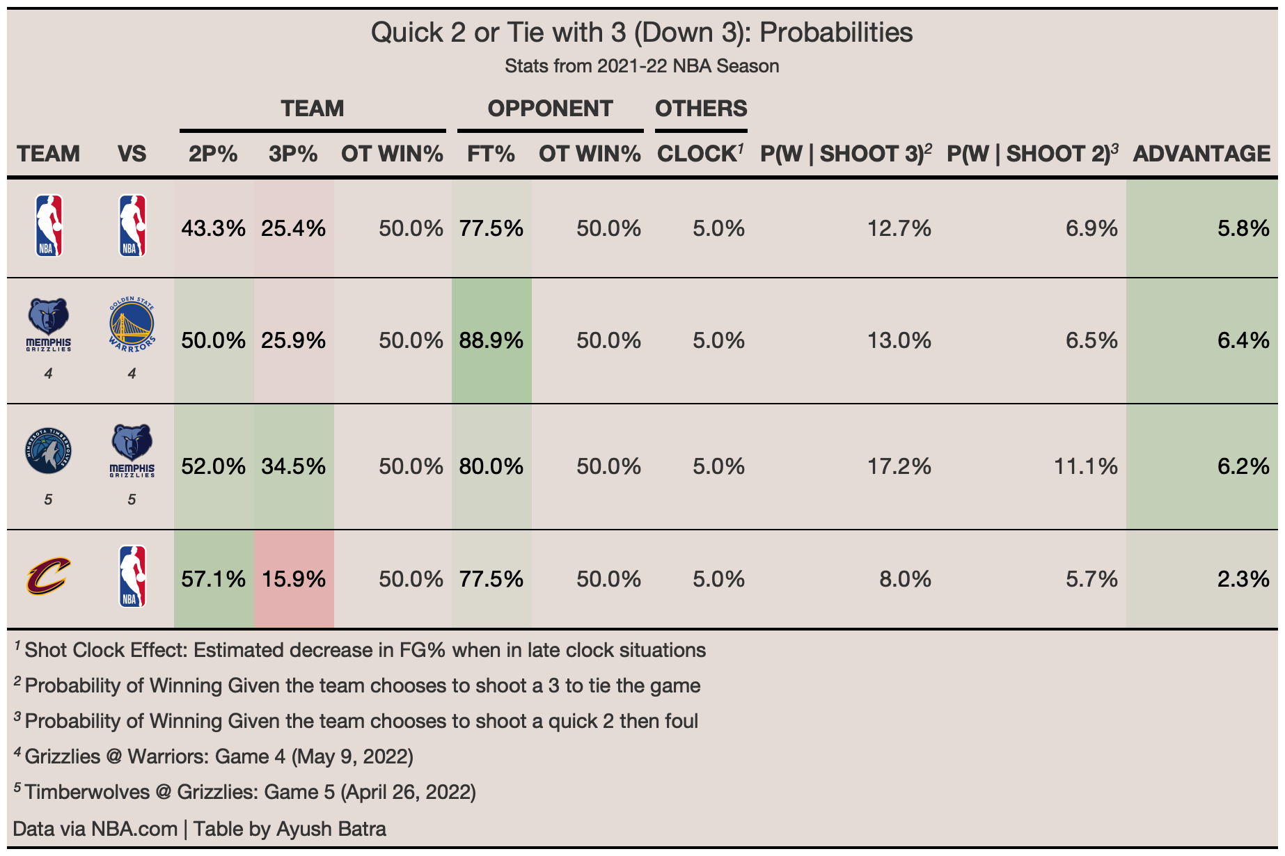However, this suggestion changes based on the relative 2-point and 3-point efficiencies for a team. For example, the Clippers had a 45% 3-point percentage in close late game situations last season, so they would be foolish to not take this 45% chance to win. On the other hand, the Cavs shot just 15% in similar situations, so they would be better off shooting a 2 and then trying to win in overtime than forcing a very low percentage shot.