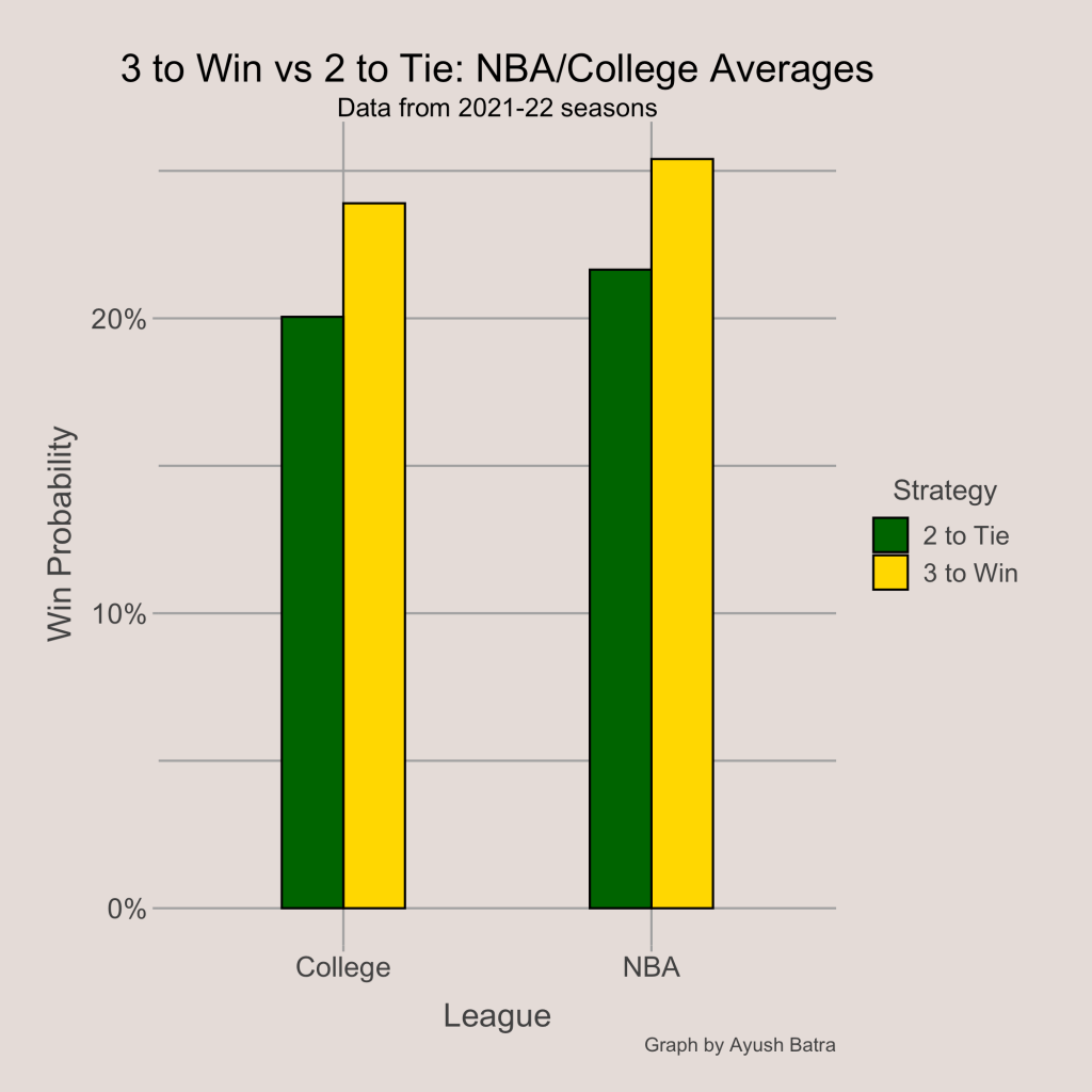 The math for the optimal choice is very simple for this case. If the team shoots a 3, the chance of winning is equal to the 3-point percentage. If they shoot a 2, the chance of winning is the 2-point percentage times the overtime win probability. As seen below, it is better to go for the 3 to win in both the NBA and college, in general.