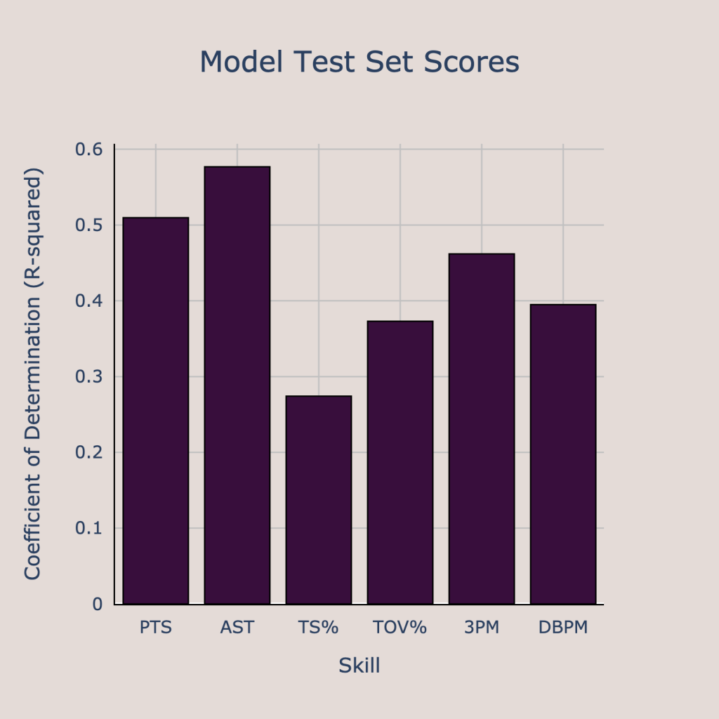 Now we have several models for different NBA stats that can tell us of a player’s creation, shooting, and defensive abilities. However, not all of the models will have the same amount of relative accuracy compared to just guessing the average value for each player. We can measure how much better each model is than random guessing by using the test score coefficient of determination. This number tells us the proportion of the variance in the dependent variable that is explained by the model, so a higher value means that the model is explaining more of the variation and is therefore performing better. The coefficients of determination are shown below.