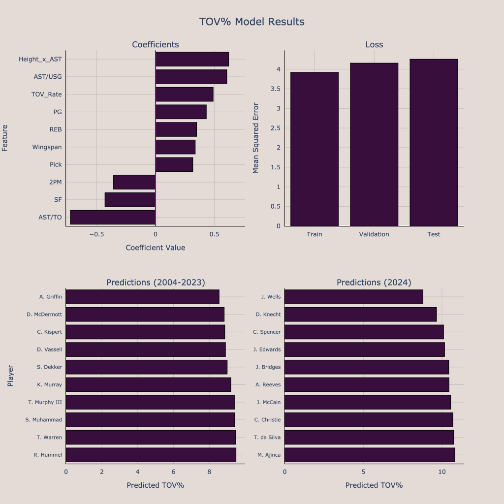 First, we can look at the results for the scoring model. I measured scoring using points per 36 minutes, so this model attempts to predict the future career points per 36 for the players in this year’s draft. To get some insights into the model, I have 4 visuals displayed below. The top left graph shows which features had the largest absolute coefficients. These are the traits that drive the predictions the most. On the top right, the training, validation, and test set losses are shown. Since this is a regression problem, the loss function I used was mean squared error. The main thing to look for here is how the test and validation loss compare to the training loss. If the test and validation losses are much larger than the training loss, then the model is generalizing poorly to unseen data and may be overfit. The bottom left and bottom right visuals display the players with the highest predicted points per 36 using this model for players in past drafts and players in this draft, respectively.