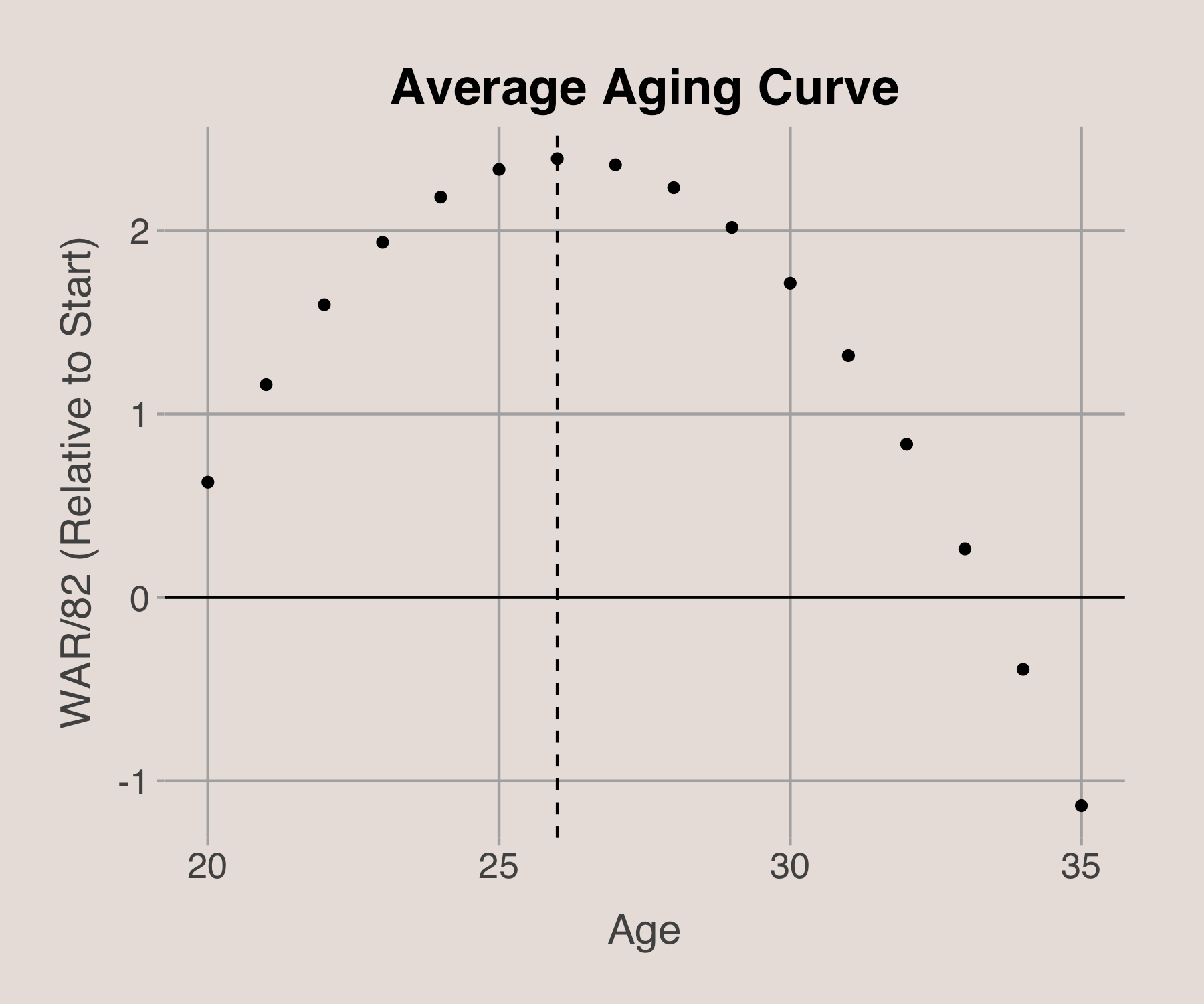 Using the posterior mean coefficients, we can construct an “average” aging curve for NBA players. This curve illustrates the typical progression of a player’s career, peaking around age 26, with the prime years spanning from ages 24 to 29.