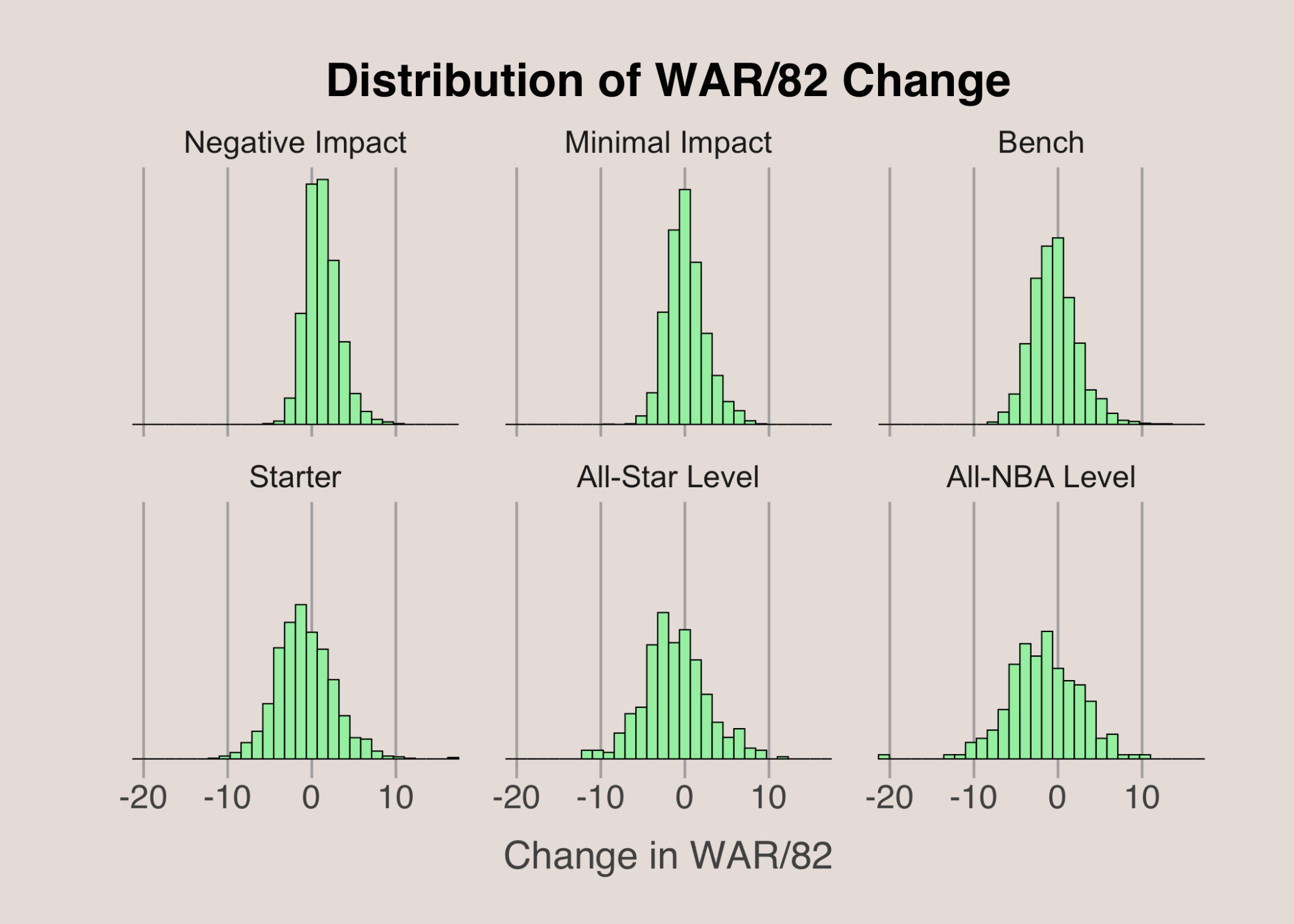 To gain deeper insights, we can analyze the change in WAR/82 by conditioning on other variables. One such variable is a player’s performance in the previous season. By binning the previous season’s WAR/82 into categories, we can explore how changes in WAR/82 depend on recent performance. I categorized previous WAR/82 into six groups: negative impact (WAR/82 below 0), minimal impact (WAR/82 between 0 and 2.5), bench (WAR/82 between 2.5 and 5), starter (WAR/82 between 5 and 10), All-Star level (WAR/82 between 10 and 15), and All-NBA level (WAR/82 over 15). While these cutoffs are somewhat arbitrary, they effectively convey the concept.