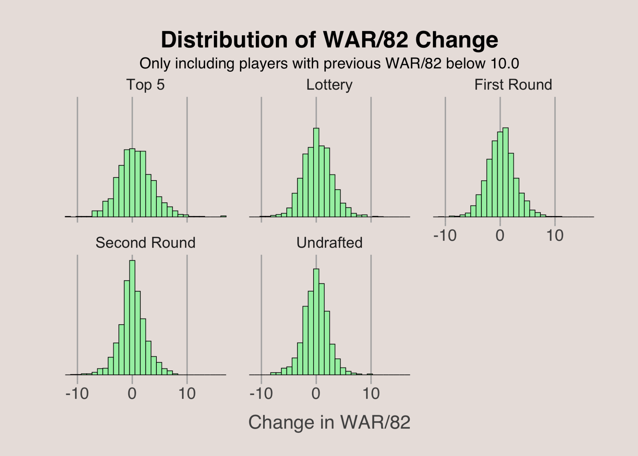 When examining the change in WAR/82 based on draft pick, we again observe differences in the distribution’s variability. This visual excludes players with a previous season WAR/82 above 10, as higher draft picks are more likely to be top performers, and we’ve already seen that top performers experience greater variability in WAR/82 changes. Even with these exclusions, top 5 picks tend to show more significant fluctuations in WAR/82, while later picks exhibit less variability. This suggests that higher draft picks are more prone to substantial improvements or declines than second-round picks or undrafted players.