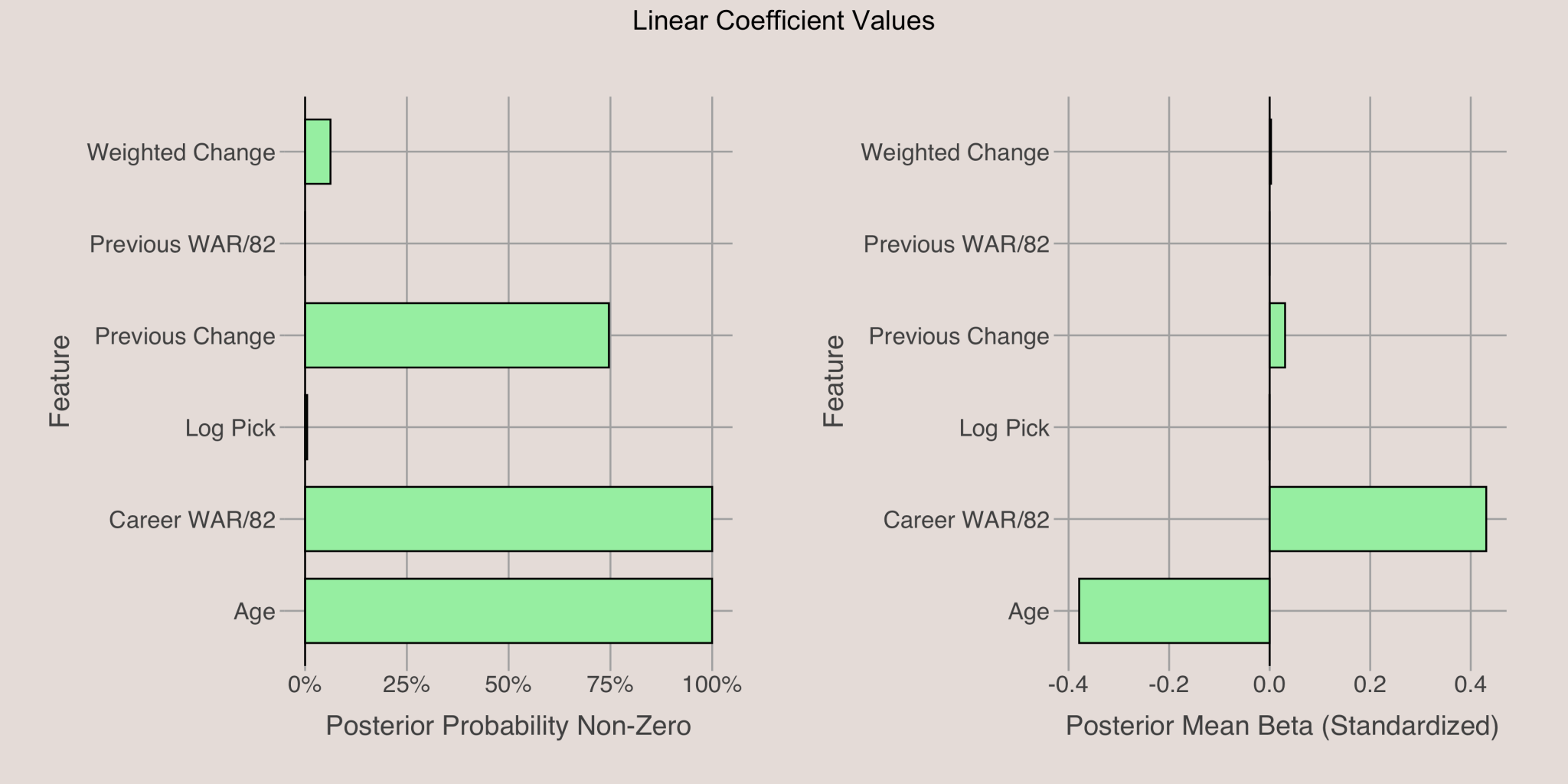 The plot below shows the posterior probabilities6 and mean values of linear coefficients for the response variable. The most influential features are age and career WAR/82, with previous change in WAR/82 also having a small effect. The other linear features have a negligible impact. Specifically, younger players and those with higher career WAR/82 are more likely to show improvement.