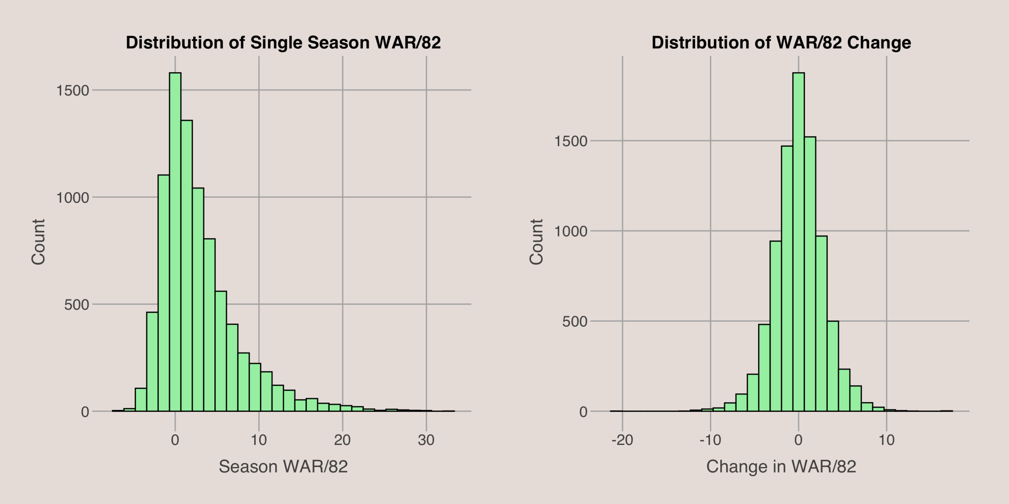 To begin, let’s examine the distribution of WAR per 82 games. The plots below show the distribution of WAR/82 for a single season and the distribution of the change in WAR/82 from one season to the next among qualifying players. The WAR/82 distribution is right-skewed, reflecting the fact that All-Star level players have a much larger impact on their team’s success than others. The distribution of the change in WAR/82 is roughly symmetric around 0, indicating that, on average, players tend to maintain their performance from year to year, with an equal likelihood of improving or declining if no other factors are considered. Typically, the change in WAR/82 from season to season falls between -5 and +5.