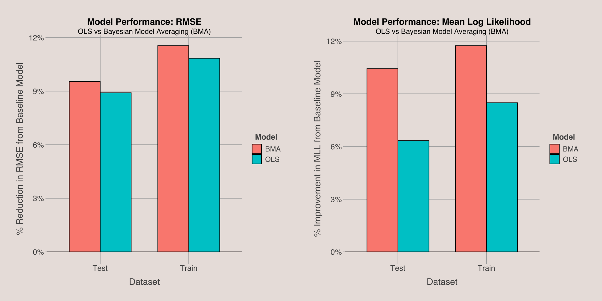 To evaluate and compare the performance of the Ordinary Least Squares (OLS) model and the Bayesian Model Averaging (BMA) approach, I used two metrics: root mean squared error (RMSE) and mean log likelihood. Instead of comparing raw values, I assessed each model’s performance relative to a baseline model5 that predicts every sample using the mean of the response variable. The comparison results are shown in the plot below. A higher bar indicates better model performance for both metrics.