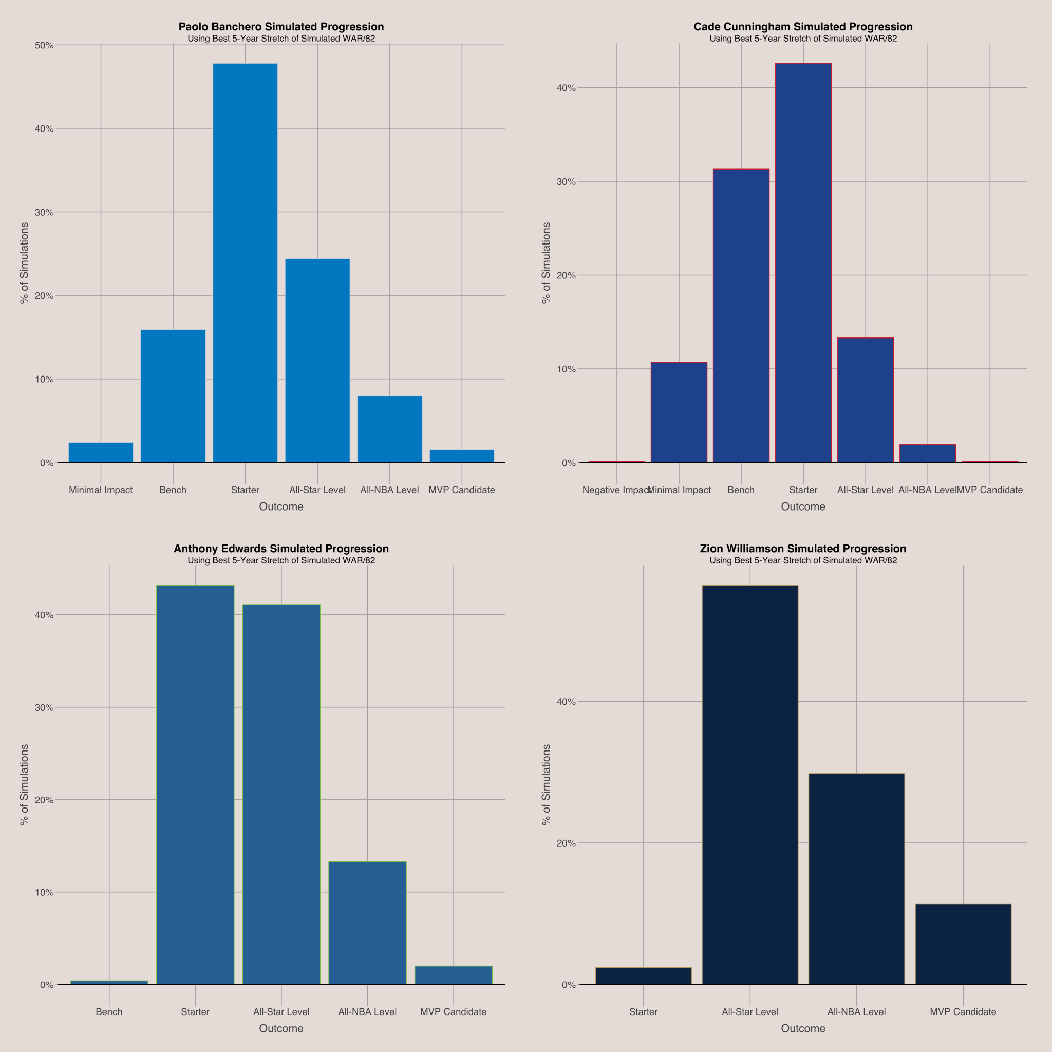 We can apply this simulation with for all players with sufficient playing time. For example, the future projections for the top picks from 2019 to 2022 reveal Zion Williamson has the best outlook, while Cade Cunningham shows the least likelihood of reaching an All-NBA level or better. Note that these categories are based on WAR/82, which might not always reflect public perceptions. For example, Paolo Banchero’s WAR/82 of 6.37 places him in the “Starter” category, despite his recent All-Star selection. You can simulate any player’s career using this web application: Simulation Tool.