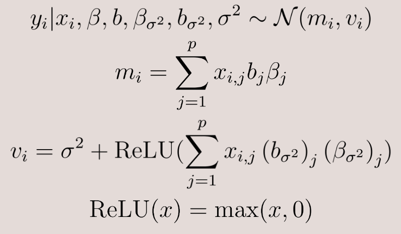 ) plus a sample-specific term. The sample-specific term is derived from a linear combination of the feature vector, a different coefficient vector, and a different binary vector. This term accounts for additional variance specific to each sample beyond the baseline variance. The ReLU function ensures that this additional variance is non-negative, avoiding the possibility of a negative variance, which is not feasible. This setup also makes sigma squared interpretable as the baseline or minimum variance.
