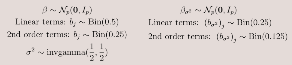 - Binary Vectors for Variance: For the binary vector associated with the variance, the prior probabilities are below. The lower prior probabilities indicate that the coefficients affecting variance must show stronger evidence to be included in the model compared to those affecting the mean.