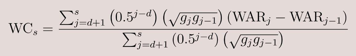 This formula takes into account a player’s change in WAR/82 across all consecutive seasons in their career, emphasizing more recent changes to better capture current performance trends.