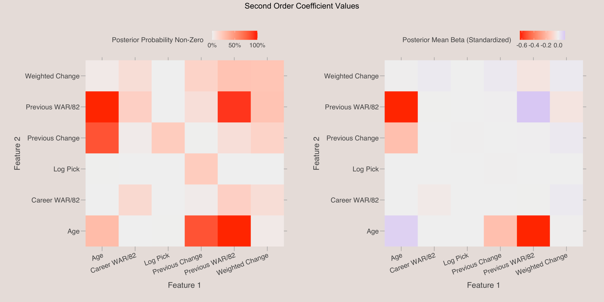 The heatmap below displays the posterior probabilities and mean values for the 2nd order coefficients. Each cell represents the effect of interactions between features. Notably, the interaction between previous WAR/82 and age is significant. The negative coefficient indicates that younger players with a high prior season WAR/82 are more likely to see significant improvement, suggesting that young, high-performing players have the potential to become superstars.