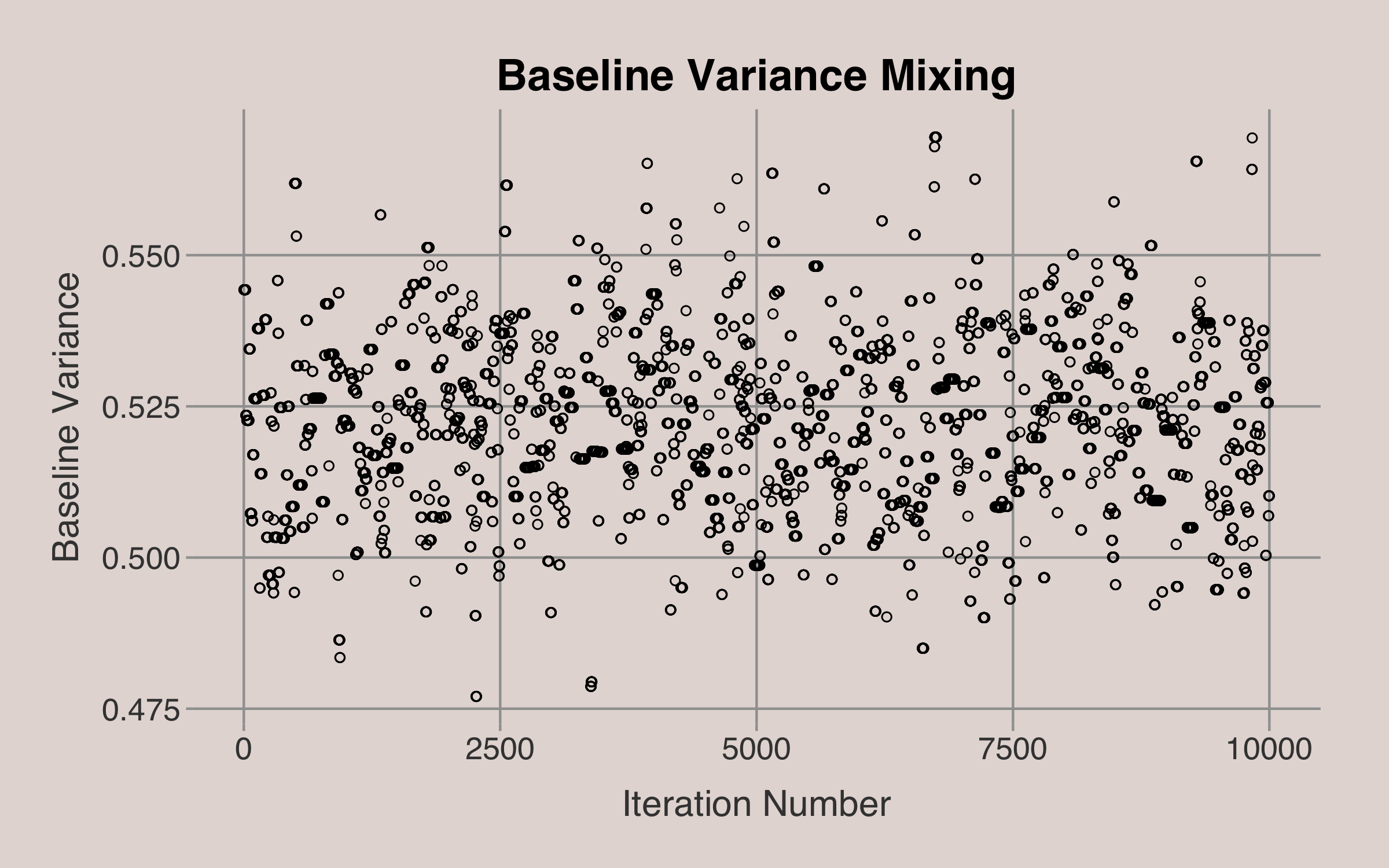 For instance, if the current baseline variance is 0.5, a proposed new value might be 0.51. We calculate the posterior probabilities of the parameters given both the current and proposed values of the baseline variance. By comparing these probabilities, one can determine whether to accept the proposed value or stick with the current one3. The entire chain of baseline variance values4 over the 10,000 iterations is shown in the plot below.