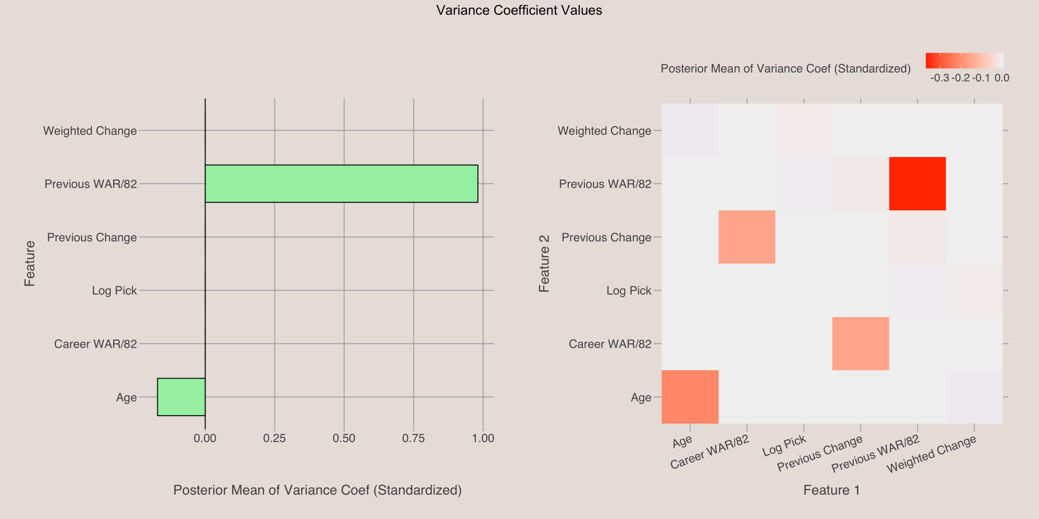 The plot below shows the posterior means for the variance coefficients. The previous season’s WAR/82 is crucial, as indicated by a coefficient with a large magnitude. The positive coefficient for this variable means players with high WAR/82 have more variable future performance. Conversely, a slightly negative coefficient for age suggests that younger players experience more variance in their performance.