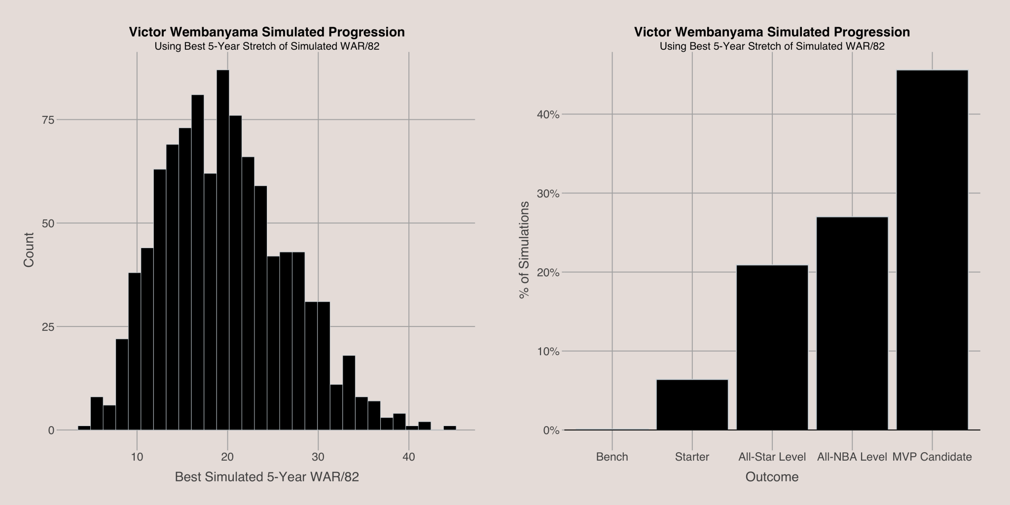 For instance, simulating Victor Wembanyama’s career over the next 10 years for 1000 iterations suggests he is very likely to become an All-NBA or MVP caliber player, aligning with fan expectations.