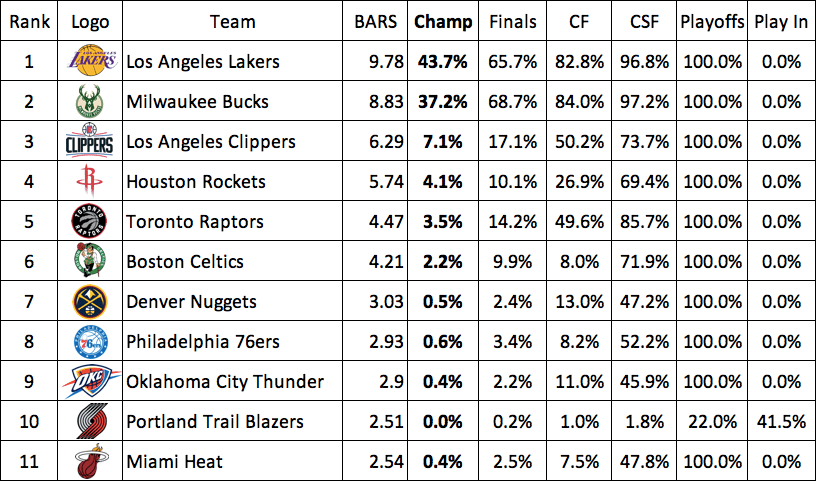 The NBA Playoffs are set to begin on July 30th with two weeks of seeding games followed by the standard postseason format. I have developed a rating for every team using season performance, quality of best players, performance against good teams, and playoff experience in order to find the probability of each team winning the championship. The BARS (Basketball Adjusted Ratings System) for each team represents their true average point differential per 100 possessions. These are different from the regular season BARS Ratings as there have been adjustments for the postseason. These ratings can be found on the ratings page and will be updated as players opt out of going to Orlando.