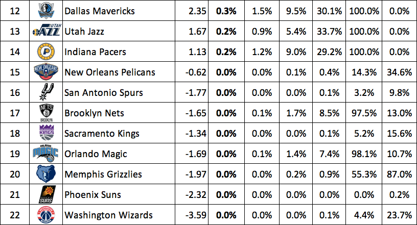 Thirteen teams have a virtually guaranteed playoff spot. The only current playoff teams in jeopardy of losing their spots are the Nets, Magic, and the Grizzlies. My model predicts that the Grizzlies have the best chance for the West 8 seed (55%), followed by the Trail Blazers (22%) then the Pelicans (14%). Meanwhile, in the East, the Wizards have just a 4% chance of making the playoffs. They are probably better off playing bench players in order to prevent injuries to important players such as Bradley Beal.