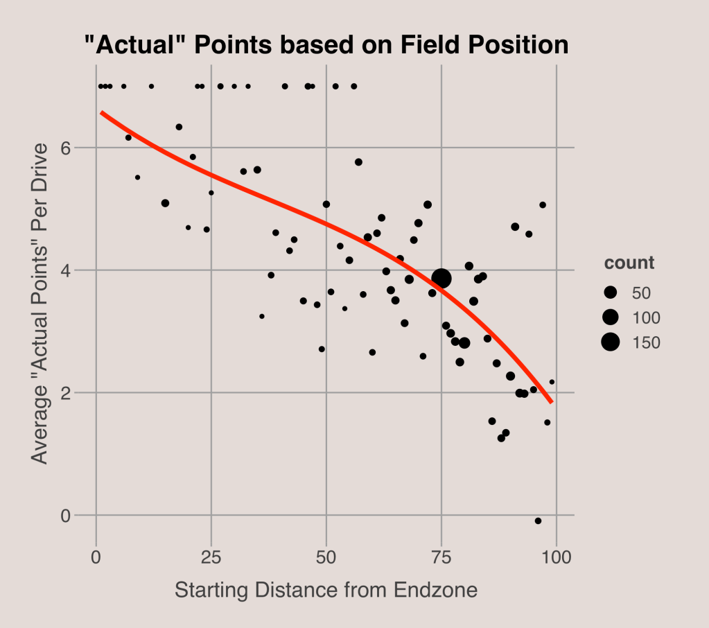 Once I gathered all the drives together, I needed to create an expected value for each drive based on starting position and an actual value based on ending field position or drive result. Therefore, I turned to expected points. A further explanation of expected points can be found here. The, the “actual value” for a drive was 7 if it ended in a touchdown, but it was equal to the expected points from the ending field position if the drive did not end in a touchdown. The “actual values” for each ending field position if a drive did not end in a touchdown are shown below.