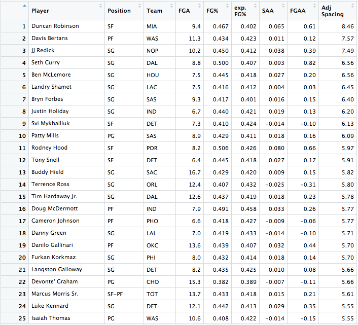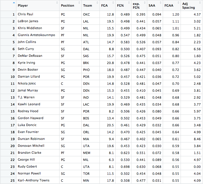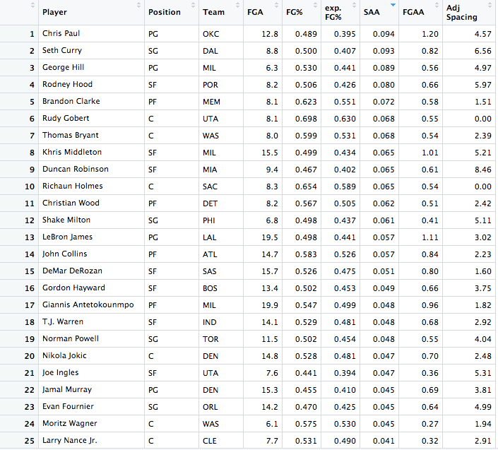 The stats below are the top 25 players in three categories: Field Goals Above Average, Shooting Above Average, and Adjusted Spacing. Explanations on the interpretations and explanations for these statistics can be found on my article on evaluating shooting in the NBA.
